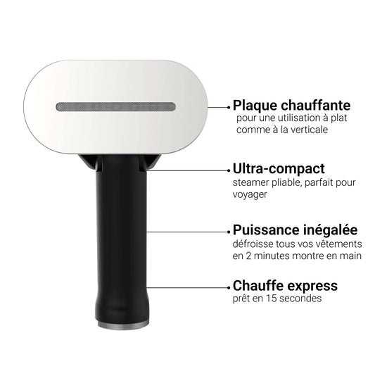 • Défroisseur vapeur portatif : compact, rapide, sans table à repasser. Idéal pour les vêtements suspendus, les retouches express et les voyages.